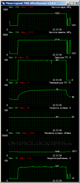 Требовательный пользователь может добиться более приемлемого акустического уровня, не прибегая к повышению напряжения и пожертвовав 30 МГц по GPU. Характеристики тестируемых видеокарт