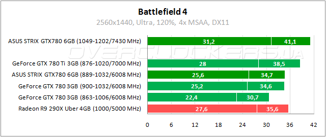 В Battlefield 4 у героя обзора минимальное отставание от Radeon R9 290X. Преимущество над GeForce GTX 780 3GB еще скромнее, но оно не связано с большим объемом буфера. Загрузка памяти при 120% и сглаживании достигала 2300–2400 МБ.