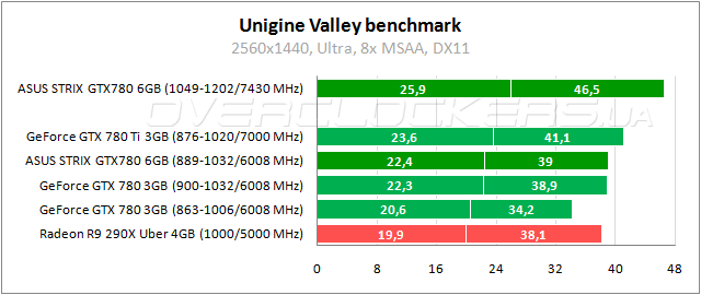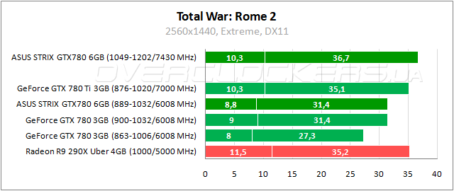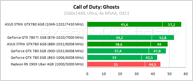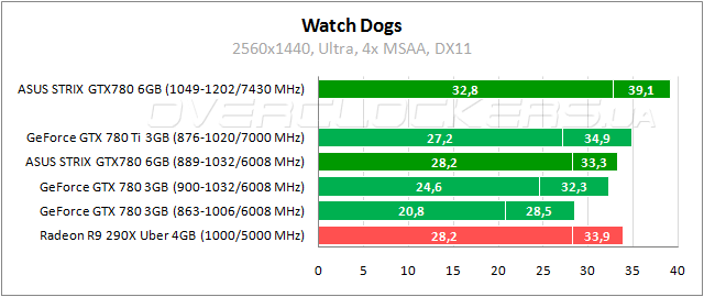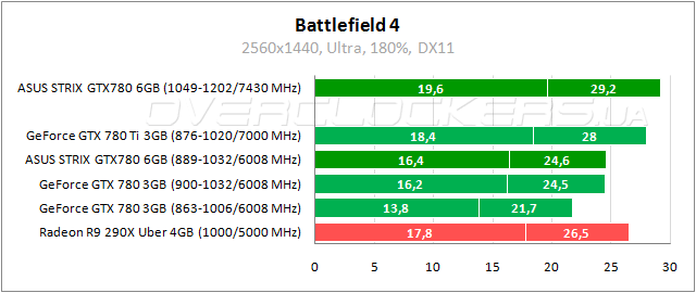 Еще одна игра, известная очень высокими серьезными требованиями, но в разрешении 2560x1440 загрузка памяти на уровне 2300 МБ во время прохождения бенчмарка. Тут лидирует Radeon R9 290X, но ASUS удается нагнать соперника за счет разгона.