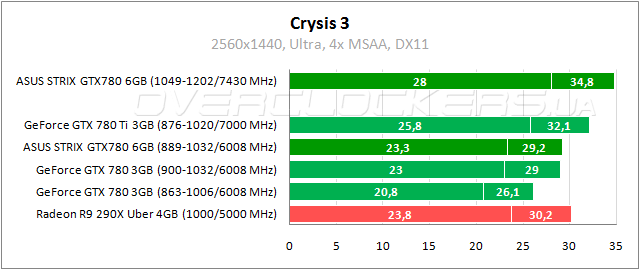 В Crysis 3 герой обзора проигрывает Radeon R9 290X до 3%. Отставание от старшего брата 10–12%. Разгон позволяет ускорить ASUS на 19–20%. Загрузка памяти на всех картах менее 2200 МБ.