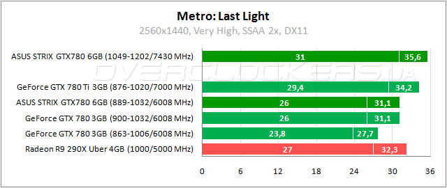 Игра Metro: Last Light, радующая глаз сочной детализированной графикой, даже при ресурсоемком сглаживании SSAA загружает не более 1120 МБ в тестовой сцене уровня «Пепелище». А это открытая локация с высокой дальностью видимости, а не узкий темный туннель. Так что объем памяти у видеоадаптеров тут не играет никакой роли. Результаты у GeForce GTX 780 при одинаковых частотах абсолютно идентичны. Минимальное отставание от Radeon R9 290X и разница с GeForce GTX 780 Ti легко перекрывается разгоном ASUS.