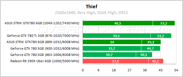 Активация сглаживания SSAA в Thief резко повышает требования к объему памяти, вызывая подтормаживания на видеокартах с 2 ГБ. Но одного дополнительного гигабайта вполне хватает для комфортной игры даже в разрешении 2560x1440 — загрузка памяти примерно 2830 МБ. ASUS Strix производительнее референса на 10–12%. Не более 15% отставание от GeForce GTX 780 Ti. Разница с конкурентом AMD на уровне 3–11% в пользу Radeon.