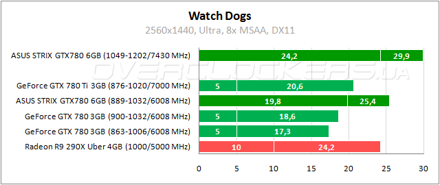 А вот Watch Dogs впервые демонстрирует необходимость наращивания памяти. Игра использует все ресурсы видеоадаптеров с 3 ГБ, демонстрируя на Radeon и Strix загрузку 3800–3900 МБ. В результате имеем вполне серьезное преимущество ASUS над собратом при идентичных частотах, особенно по минимальному fps — почти 15%. Даже старший GeForce GTX 780 Ti чуть проигрывает герою обзора по минимальному показателю, обгоняя его только по средней частоте кадров.