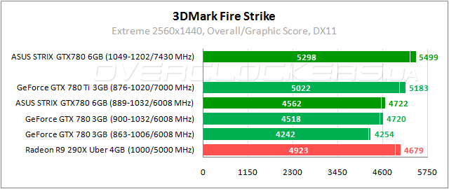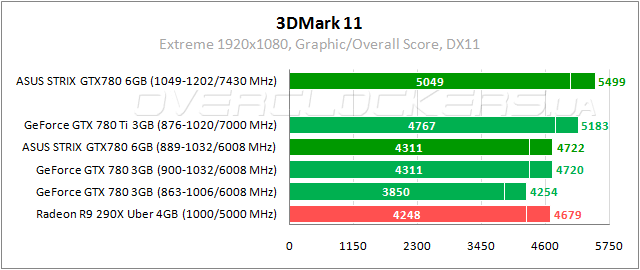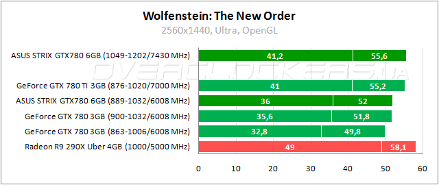 Абсолютно идентичные результаты у GeForce GTX 780 с разным объемом памяти. Преимущество 1,5% над конкурентом от AMD. Отставание менее 11% от GeForce GTX 780 Ti. Прирост от разгона 17%.