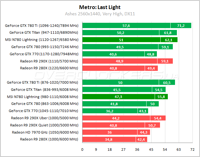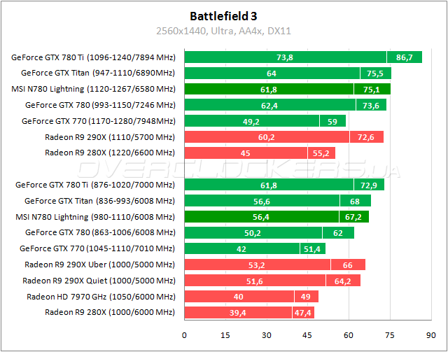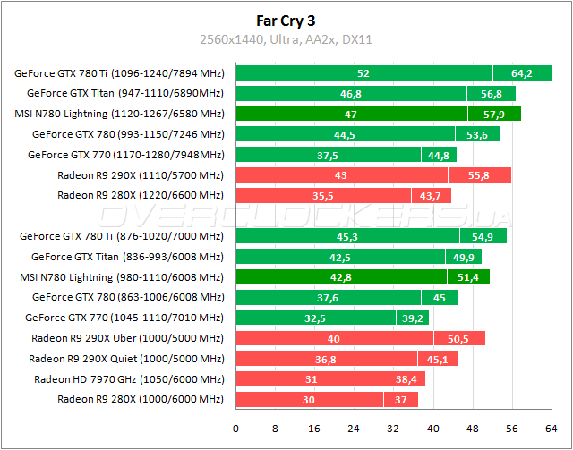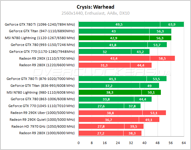 Результаты MSI на 13% лучше стандартной версии GeForce GTX 780 в Warhead, что обеспечивает небольшое преимущество над Titan. Radeon R9 290X удается вырвать победу у Lightning с разницей 1–6%. Нагнать и обойти соперника помогает разгон.