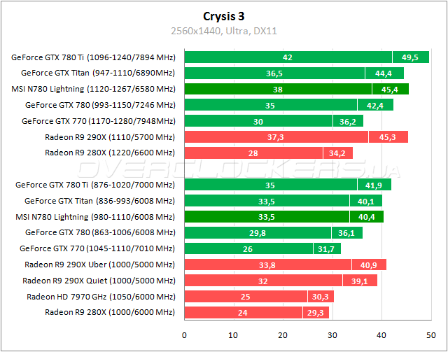 В Crysis 3 у Lightning наблюдается небольшое преимущество над Titan в номинале и в разгоне. Производительность Radeon R9 290X почти на таком же уровне с минимальным преимуществом. Разгон MSI легко позволяет обойти работающий в номинале GeForce GTX 780 Ti.