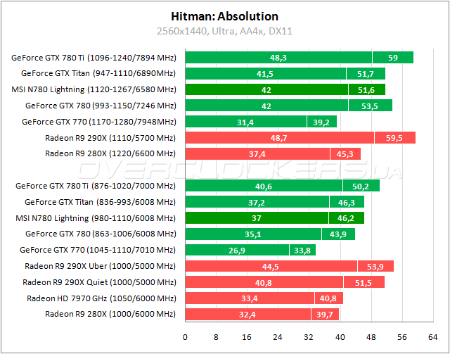 Последняя часть Hitman симпатизирует AMD. Теперь Lightning не только уступает Radeon R9 290X в режиме Uber, но даже при разгоне не дотягивает до его уровня производительности. Стоит обратить внимание и на небольшое преимущество форсированного GeForce GTX 780 стандартного дизайна относительно ускоренного MSI. Память в данном случае явно сдерживает потенциал карты.