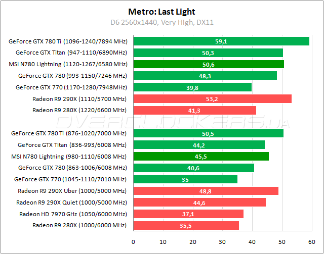 В Metro: Last Light разница 2–4% между Lightning и Titan в пользу героя обзора. Radeon R9 290X слабее его на 3–7%.