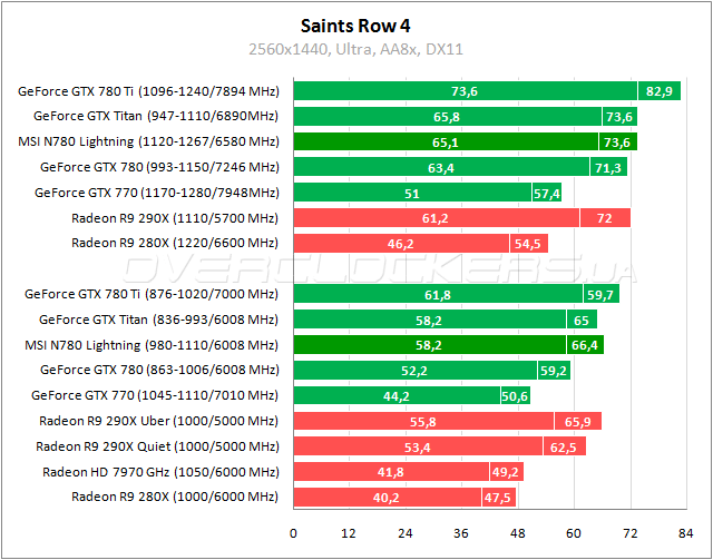 В Saints Row ситуация вполне стандартная: Lightning чуть лучше Titan и Radeon R9 290X. В разгоне представители NVIDIA демонстрируют равные результаты.