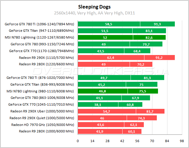 Lightning в Sleeping Dogs сопоставим с Radeon R9 290X в режиме Quiet, но перевод последнего в нормальный режим оставляет MSI позади. Нагнать и немного обогнать старшие видеоадаптеры помогает разгон. Прирост от повышения частот составил 9–11%.