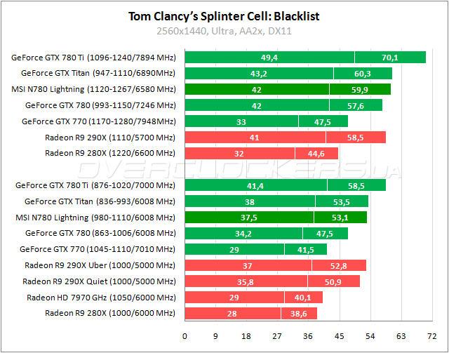 В Splinter Cell: Blacklist рассматриваемый адаптер чуть сдает позиции относительно Titan, позволяя тому выйти вперед. Преимущество над флагманом AMD сохраняется, но оно весьма скромное. Разгон дает прирост производительности 12–13%.