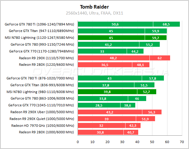 При заводских частотах в Tomb Raider Titan уступает Lightning, при разгоне они равны. У старшего Radeon небольшое преимущество над видеоадаптером MSI во всех режимах.