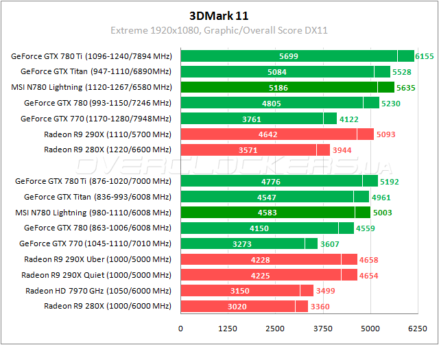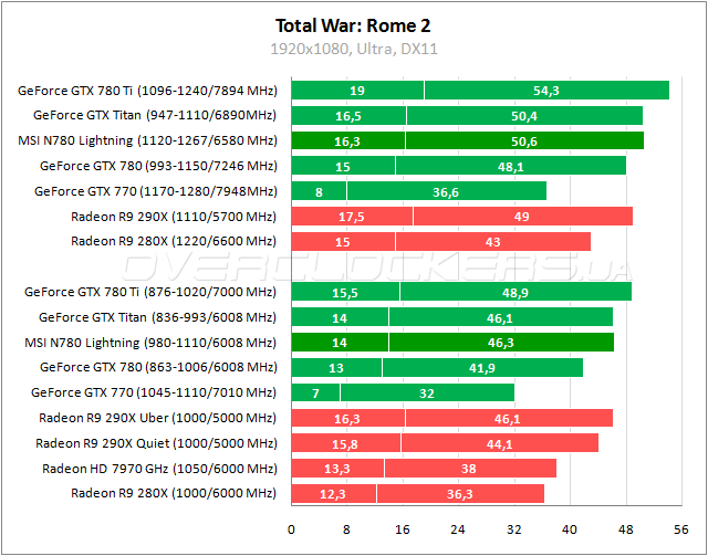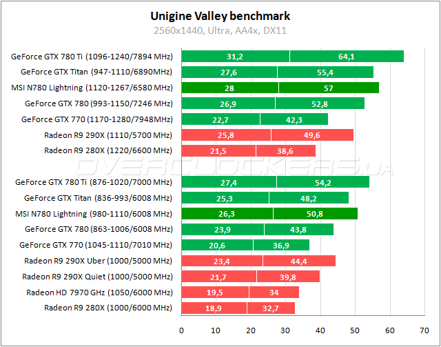 Выигрыш менее 1% относительно Titan. Преимущество в 8% над Radeon R9 290X. При разгоне всех участников у MSI второе место после форсированного GeForce GTX 780 Ti.