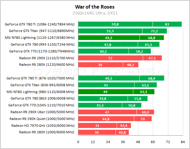 В War of the Roses преимущество MSI Lightning над референсом не превышает 11%. Старший Radeon лучше по минимальному fps. Разгон ускоряет Lightning еще на 12–13%, что позволяет выйти на уровень производительности GeForce GTX 780 Ti.