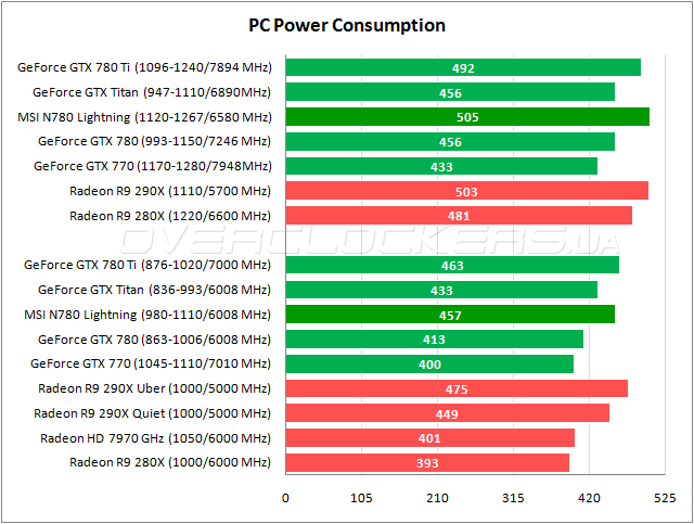 Внушительный заводской разгон приводит к тому, что показатели энергопотребления у N780 Lightning заметно выше стандартных. Минимальная разница с GeForce GTX 780 Ti. Более ощутимый выигрыш относительного старшего Radeon. Но при разгоне с софтвольтмодом самым прожорливым оказывается именно MSI.