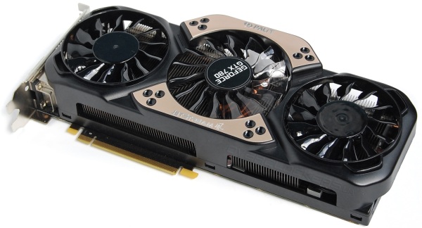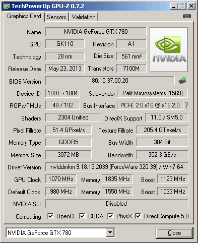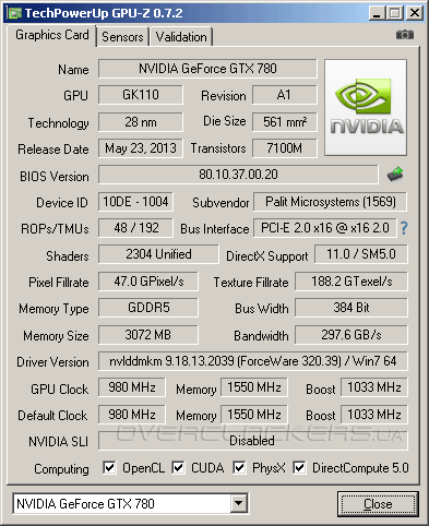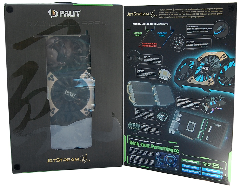 Palit выпускает две версии GeForce GTX 780 JetStream, которые отличаются рабочими частотами. Младшая (NE5X780H10FB-1100J) работает на базовой частоте ядра 902 МГц при Boost Clock 954 МГц и стандартной частоте памяти. Наша карта, как уже говорилось выше, является топовой у Palit. Ее частотные характеристики следующие: Base Clock 980 МГц, Boost Clock 1033 МГц, память 6200 МГц.