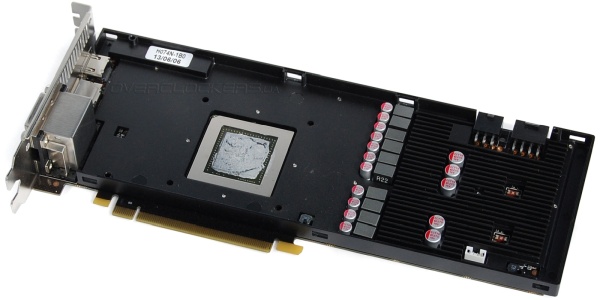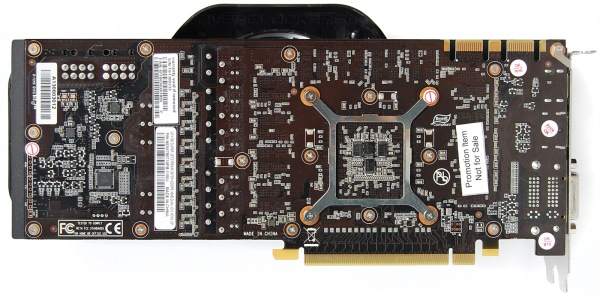 Основание кулера является радиатором, который отводит тепло от микросхем памяти и силовых компонентов. Эта пластина полностью накрывает плату и даже имеет ребристую форму в районе узла питания для увеличения площади рассеивания.