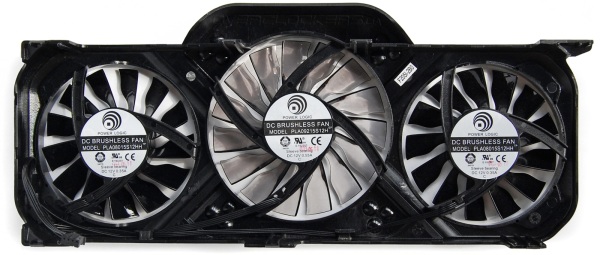 Верхний кожух с вентиляторами снимается без полного разбора видеокарты. Он держится на защелках, достаточно нажима по краям, чтобы его снять. Так что в случае необходимости можно легко произвести очистку системы охлаждения от пыли, никакая гарантийная наклейка в этом не помешает. Сами вентиляторы от Power Logic. Крайние модели диаметром 80 мм, центральный на 92 мм.