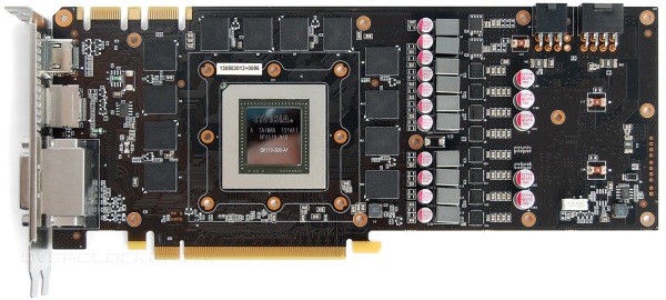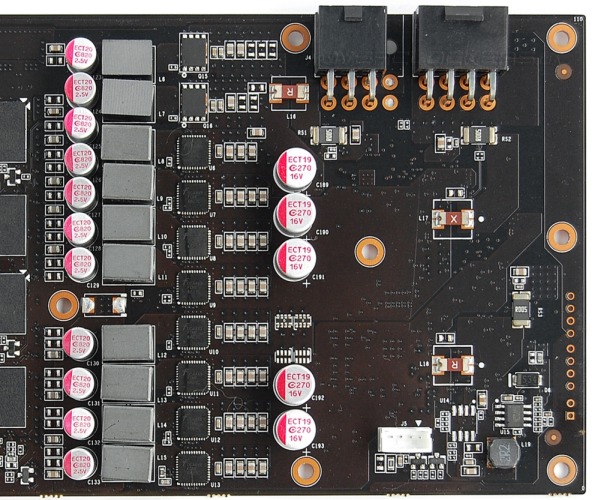 Графический процессор запитан от восьмифазного преобразователя напряжения, для памяти реализован стандартный двухфазный стабилизатор.