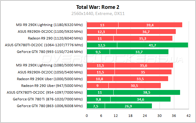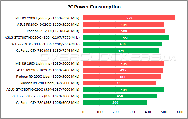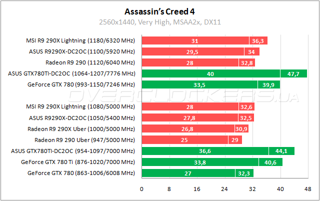 Рассмотренный видеоадаптер сравним с референсным GeForce GTX 780 Ti (в номинале) и GeForce GTX 780 (в номинале и разгоне). Среди конкурентов AMD — нереференсные версии Radeon R9 290X от MSI и ASUS. Последний выступает и в роли стандартной версии Radeon R9 290X. Еще добавлен Radeon R9 290 (ASUS R9290-DC2OC-4GD5).
