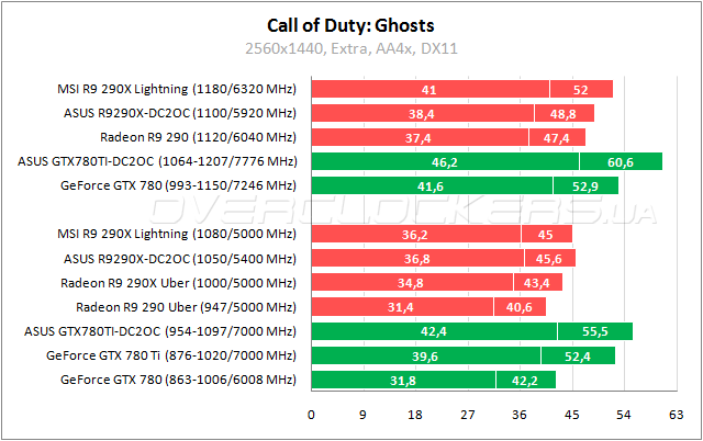 В Ghosts герой обзора демонстрирует преимущество менее 7% над обычным собратом. Прирост от разгона на уровне 9%. R9 290X Lighting даже на повышенных частотах слабее ASUS в номинале.