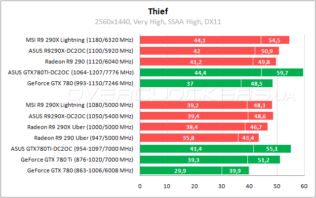 Герой обзора обходит Lighting в Thief на 6–14%. Обычный Radeon R9 290X слабее на 8–15%.
