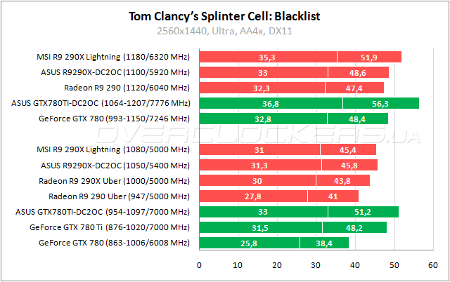 В Blacklist рассматриваемый ASUS обгоняет Radeon R9 290X на 10–17%, разница с Lighting на уровне 6–13%. У ASUS изначально производительность уровня разогнанного Lighting.