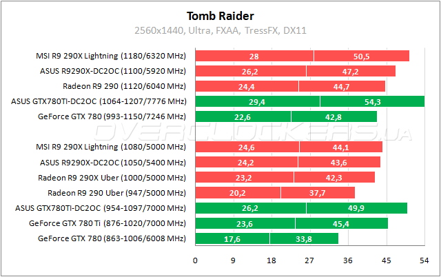 Удерживает лидерство ASUS и в Tomb Raider, обгоняя референсного собрата на 10–11% и самого старшего представителя AMD на 7–13%.