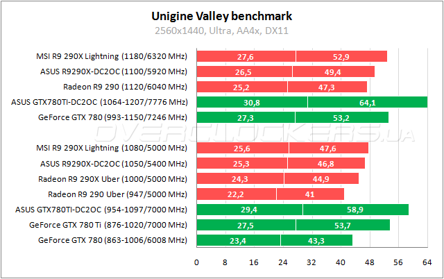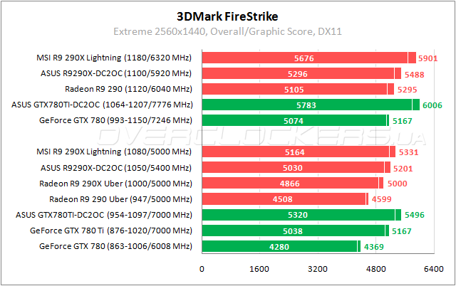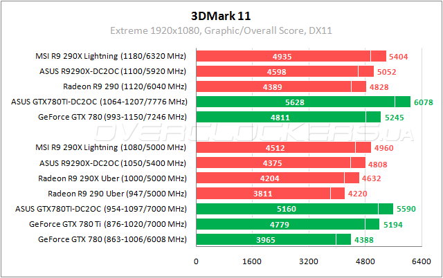 ASUS на 6-10% лучше обычной версии. Преимущество над самым быстрым Radeon R9 290X достигает 13–15%. Разгон ускоряет видеоадаптер на 8–11%.
