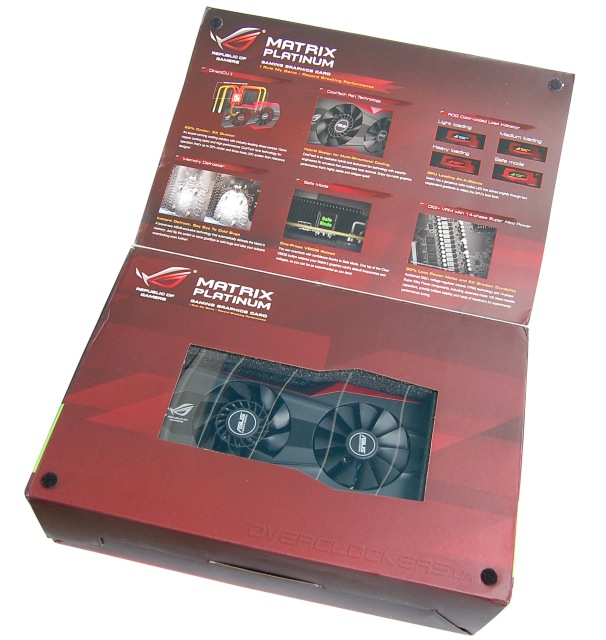 Боковая панель откидная. На развороте описаны основные особенности ASUS Matrix Platinum. Через прозрачное окошко видно солидную систему охлаждения.