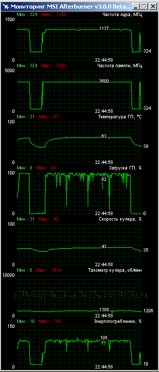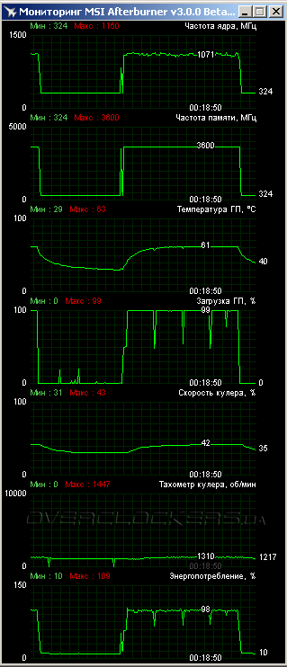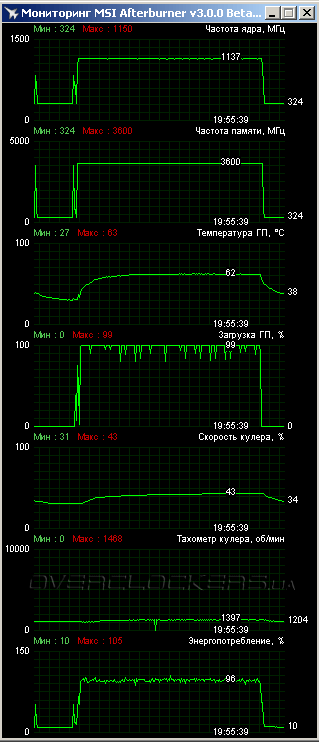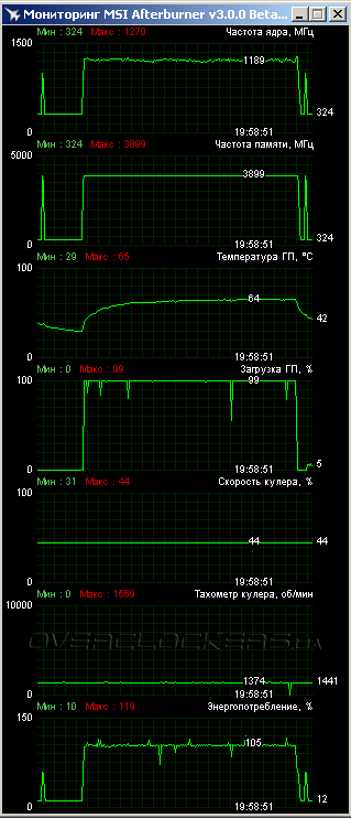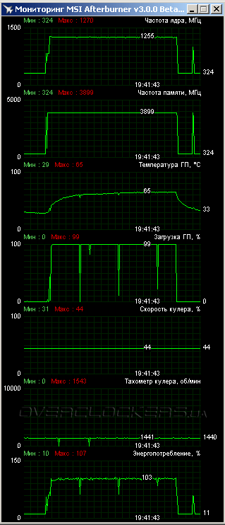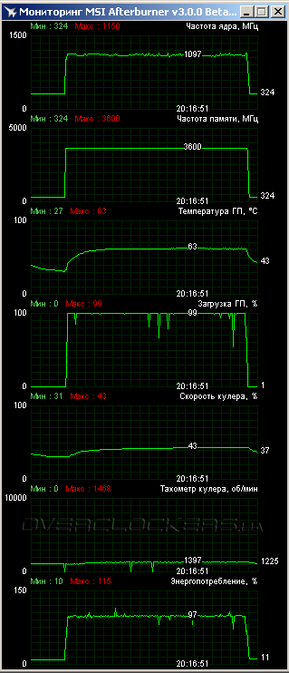 В Crysis основной рабочей частотой ядра было значение 1255 МГц с небольшими просадками до 1241 МГц. В более тяжелых играх частоты снижались сильнее. В Unigine Valley основной диапазон ограничивался рамками 1189–1228 МГц при редких скачках до 1241 МГц и понижениях до 1176 МГц.