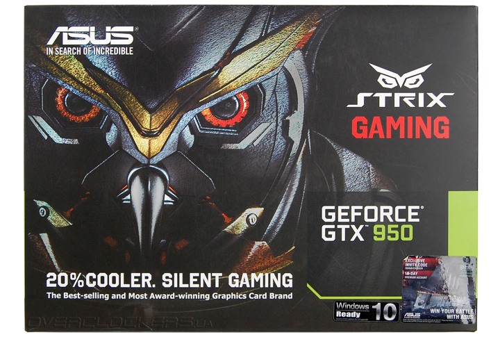Начнем с изучения топовой версии GeForce GTX 950 от ASUS, которая относится в линейке Strix и имеет подзаголовок Gaming. Поставляется в небольшой упаковке традиционного для серии дизайна.