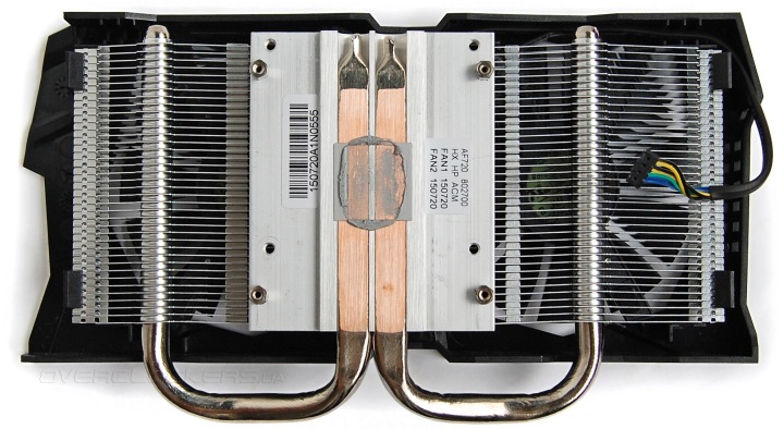 Система охлаждения проще относительно ASUS GeForce GTX 960, но аналогична той, что охлаждает ASUS Radeon R7 370. Используется только две тепловые трубки, зато они диаметром 8 мм.