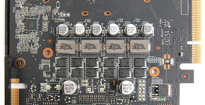 У ASUS один разъем питания, который развернут защелкой вверх, и один разъем под SLI. Вдоль боковой грани тянется ребро жесткости.