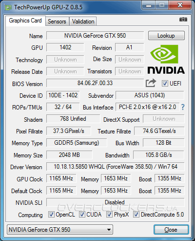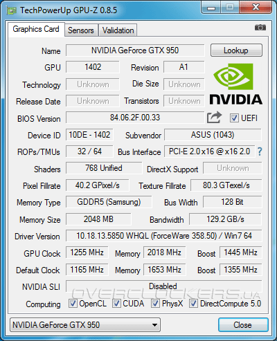 Разогнать ASUS удалось до 1255 МГц по базовой частоте при пиковом значении Boost 1533 МГц. Это чуть меньше результатов MSI GTX 950 Gaming 2G и Inno3D iChill GeForce GTX 950 2GB Ultra. Память смогла стабильно работать на частотах 8074 МГц, а это уже лучший результат среди ранее протестированных GeForce GTX 950. Лимит мощности был повышен до максимума.
