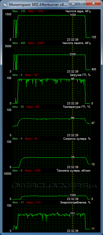 Что касается реальных рабочих частот, то Boost достигал 1430–1443 МГц. В большинстве приложений GPU работал в этом диапазоне. В Metro: Last Light и некоторых других тяжелых тестах были редкие снижения частоты до 1418 МГц.