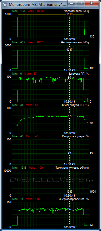 В игровой нагрузке частота ядра варьировалась в диапазоне 1520–1533 МГц. Небольшое повышение скорости вентиляторов за счет ручных настроек позволило сохранить уровень рабочих температур на начальном уровне при низком уровне шума.