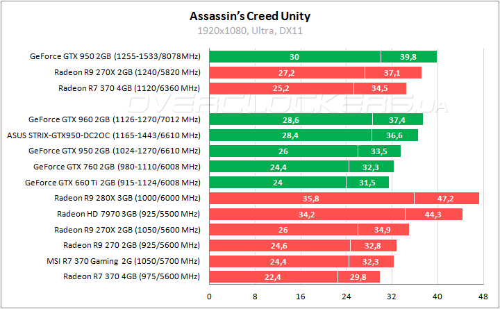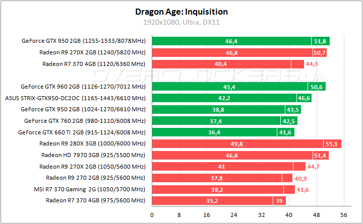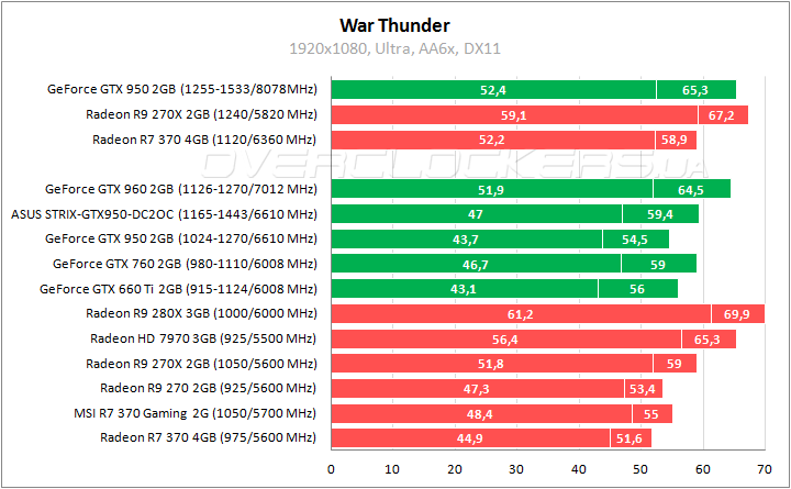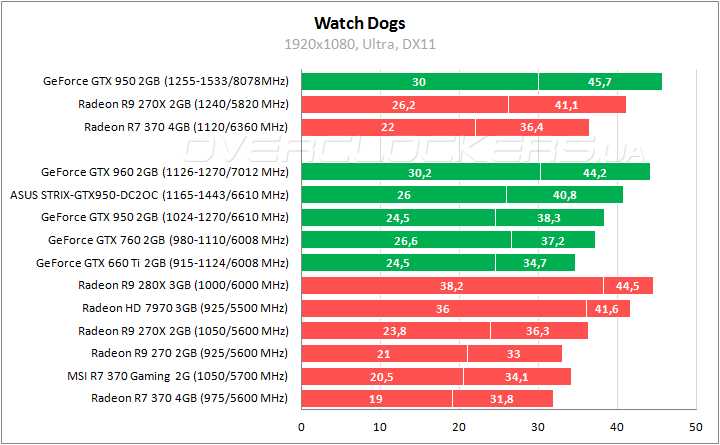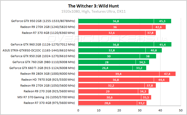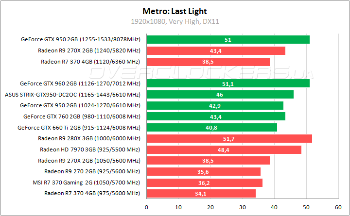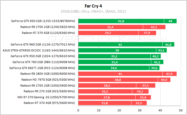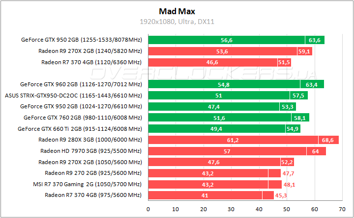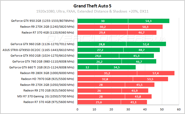 GeForce GTX 950 уступает 18–19% старшему брату, по средней частоте кадров немного обгоняя Radeon R9 270, но уступая ему же по минимальному fps. Аналогичное соотношение между GeForce GTX 950 и Radeon R9 270X. Разгон позволяет ASUS GTX 950 выйти на уровень GeForce GTX 960 и приблизиться к Radeon HD 7970. Radeon R7 370 проигрывает менее 5% Radeon R9 270, а модель от MSI уже быстрее. С разгоном Radeon R7 370 выходит на уровень производительности Radeon R9 270X.