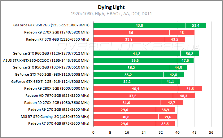 В Dying Light между GeForce GTX 950 и GeForce GTX 960 разница менее 14%, ASUS Strix Gaming проигрывает лишь 5%. Младший видеоадаптер на GM206 производительнее GeForce GTX 760 на 4–9% и быстрее Radeon R9 270X на 4–14%. Последний при разгоне не дотягивает до уровня ASUS по минимальному fps. Radeon R7 370 традиционно в конце списка. Его отставание от GeForce GTX 950 на уровне 15–22%. Максимальный разгон Radeon R7 370 позволяет чуть обойти соперника с начальными частотами. GeForce GTX 950 со своим разгоном легко обгоняет GeForce GTX 960 и Radeon R9 280X.