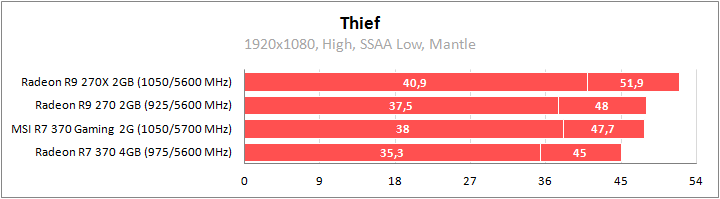 До 15% разница между GeForce GTX 950 и GeForce GTX 960 в Thief. У GeForce GTX 950 минимальное отставание от Radeon R9 270X. GeForce GTX 760 показывает близкие результаты по средней частоте кадров, но по минимальному fps проигрывает 10%. У Radeon R7 370 минимальное отставание от Radeon R9 270, разгон вновь позволяет настичь Radeon R9 270X.