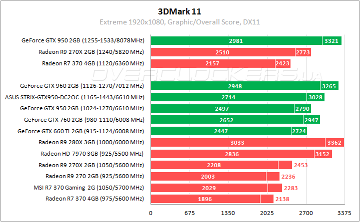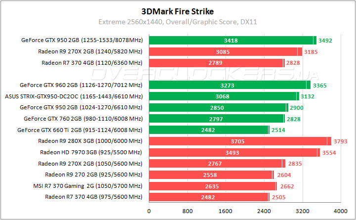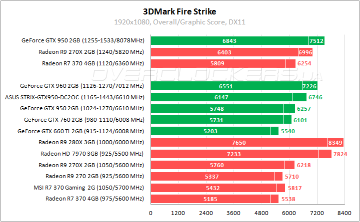 Ситуация немного меняется в Fire Strike. Разница меду GeForce GTX 950 и GeForce GTX 960 снижается до 16%, а преимущество младшего представителя над Radeon R9 270X сводится к одному-двум процентам. GeForce GTX 760 незначительно уступает GeForce GTX 950. У Radeon R7 370 отставание от Radeon R9 270 на уровне 4%, а в разгоне удается свести к минимуму разницу с GeForce GTX 950.