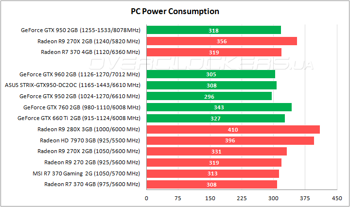 Вполне ожидаемо самым экономичным решением является GeForce GTX 950. Но показатели Radeon R7 370 выше лишь на несколько ватт, так что нельзя говорить о каком-то серьезном преимуществе представителя NVIDIA. С другой стороны, его лучше сравнивать с ближайшим аналогом по производительности в лице Radeon R9 270X, а на таком фоне новичок Maxwell выглядят еще лучше. По результатам можно утверждать, что нестандартные варианты GeForce GTX 950 с заводским разгоном потребляют мощность на уровне обычных версий GeForce GTX 960.