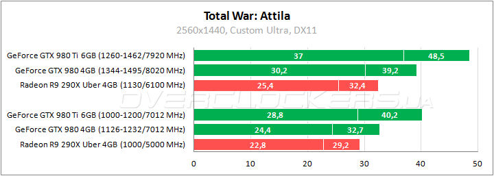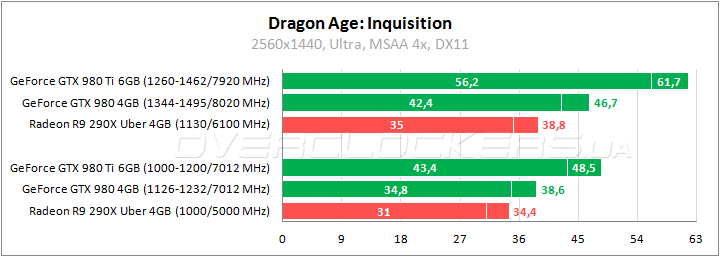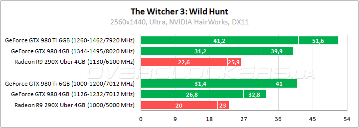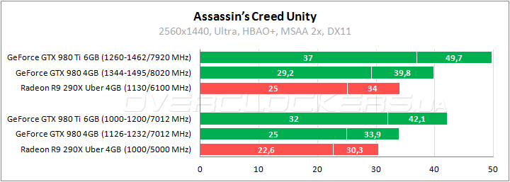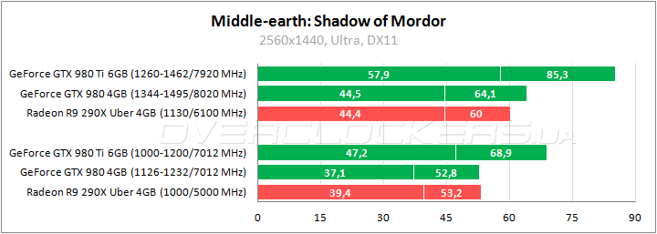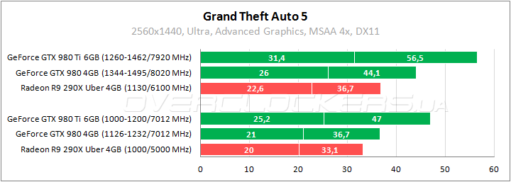 Преимущество над GeForce GTX 980 на уровне 27–29%, отрыв от Radeon R9 290X на уровне 30–40%. Разгон ускоряет GeForce GTX 980 Ti на 29% по минимальному fps и на 17% по среднеигровому показателю частоты кадров.