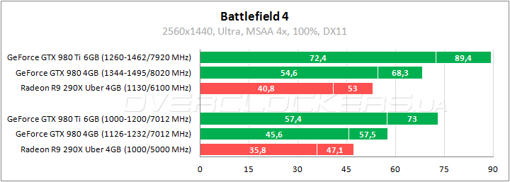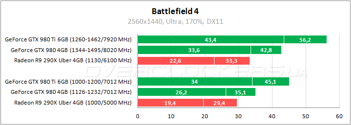 Преимущество старшего GeForce над младшим собратом в Battlefield 4 составляет 26–27%. В номинале новичок быстрее разогнанного товарища. Разница с представителем AMD на внушительном уровне 55–60%.