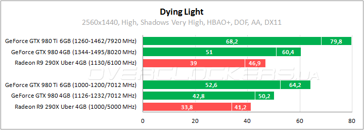 В Dying Light новичок быстрее младшего товарища на 23–28%, отрыв от представителя AMD почти 56%. Форсированный GeForce GTX 980 снова немного уступает GeForce GTX 980 Ti с заводскими частотами. Разгон ускоряет новичка на 24–30%.