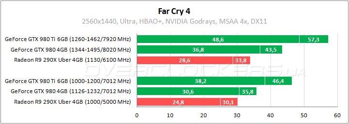Ultra-качество в сочетании с высоким качеством сглаживания ставит на колени Radeon в Far Cry 4. У GeForce GTX 980 уже приемлемые результаты, а у GeForce GTX 980 Ti еще выше. Разница между товарищами NVIDIA на уровне 25–30%. Производительность разогнанного GeForce GTX 980 приближается к уровню GeForce GTX 980 Ti, но все еще чуть ниже. Последний от повышения своих частот выигрывает 23–27%.