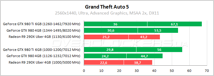Привычная расстановка сил. Лидирует GeForce GTX 980 Ti с отрывом 25% от младшего товарища и более 50% относительно Radeon. Разгон придает ускорение около 20%.