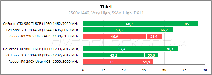 «Вор» является одной из самых красивых и технологичных игр на базе третьей версии движка Unreal Engine. Тут разница между участниками NVIDIA на уровне 26–27%. Между лидером и асутсайдером от AMD разница более 35%. В разгоне GeForce GTX 980 вновь немного не дотягивает до уровня старшего брата, а GeForce GTX 980 Ti при повышении своих частот наращивает мощь на 19–21%.