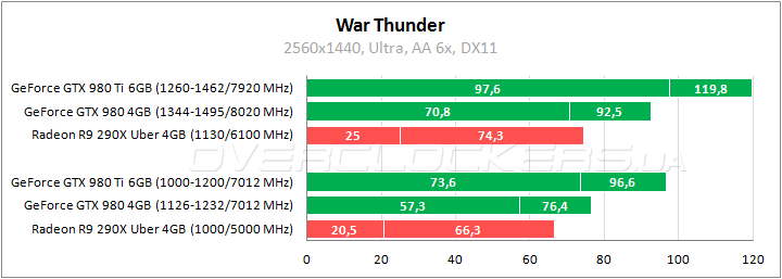После обновлений периодически меняется общая производительность в игре, иногда наблюдается и снижение результатов. В последней версии War Thunder имеет место именно такая ситуация. Если обратиться к одному из старых сравнений GeForce GTX 980 и Radeon R9 290X, то можно констатировать снижение fps в новой версии игры. При этом у представителя AMD еще и начал «гулять» минимальный fps — от 12 до 60 кадров. Ситуация для Radeon неприятная, но временная, по мере обновлений игры и видеодрайвера производительность должна стабилизироваться. Так что Radeon хоть и занимает последнее место, но не все так плохо, как могло бы показаться. GeForce GTX 980 Ti быстрее собрата на 26–28%, с разгоном он повышает свои результаты еще на 24–32%.