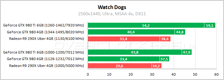 В Watch Dogs разница между двумя GeForce на уровне 28–31%. Между лидером и аутсайдером разница 40–48%. Прирост от разгона 23–24%. Высокие показатели позволяют надеяться на приемлемые результаты при экстремальном качестве сглаживания.